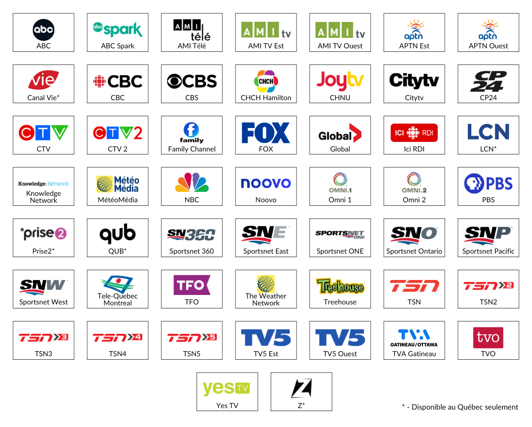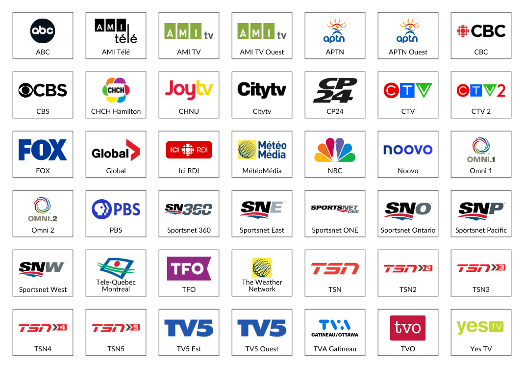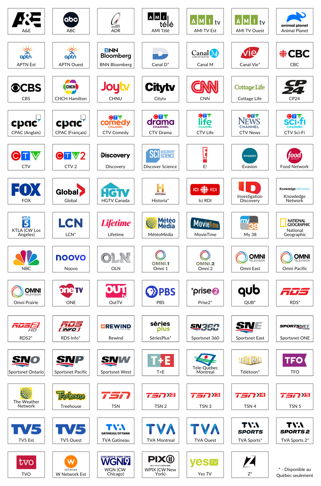 A&E Channel Logo ABC Spark Channel Logo ADULT SWIM Channel Logo Al Jazeerah Channel Logo Animal Planet Channel Logo BBC EARTH Channel Logo BBC First Channel Logo Bein Sports Logo BEIN Sports Channel Logo BNN Bloomberg Channel Logo Canal D Channel Logo CANAL VIE Channel Logo CARTOON NETWORK Channel Logo CBC News Network Channel Logo CMT Channel Logo CNN Channel Logo Cooking Channel Canada Channel Logo Cottage Life Channel Logo CP24 Channel Logo Crave HD Network Logo Crime + Investigation Channel Logo CTV Comedy Channel Logo CTV Drama Channel Logo CTV Life Channel Logo CTV News Channel Logo CTV SCI-FI TV Channel Logo Dejaview Logo Discovery Logo Discovery Science Logo Discovery Velocity Logo Disney Channel Logo Disney Junior Logo Disney XD Logo Documentary Channel Logo DTOUR Logo E! Logo Fairchild TV Channel Logo Family Channel Logo Family Chrged Logo Family Jr. Logo Fight Network Logo Filippino TV Logo Food Network Canada Logo FOX News Logo FX Logo FXX Logo Game+ Logo GameTV Logo GMC Logo History Channel Logo HGTV Logo Historia Channel Logo History Channel Logo HLN Logo Hollywood Suite Logo Investigation Discovery Logo CW LA (KTLA) Logo Le Canal Nouvelles Logo Lifetime Logo Love Nature Logo Magnolia Network Channel Canada Logo Makeful Logo MovieTime Logo MTV Logo MUCH Logo Nat Geo Wild Channel Logo National Geographic Channel Logo NGTV Logo Nick Channel Logo ONE GET FIT Channel Logo OLN Channel Logo OUTTV Channel Logo OWN CANADA Channel Logo PRISE 2 Channel Logo QUB Logo RDS Info Channel Logo REWIND Channel Logo ROTANA CLIP Channel Logo RTS SAT Logo RTVI Logo SBTN Logo Series Plus Channel Logo Showcase Channel Logo Silver Screen Classic Channel Logo SLICE Channel Logo Smithsonian Channel Logo Sportsnet One Channel Logo SN WORLD Channel Logo Sportsnet 360 Channel Logo Sportsnet Channel Logo Starz HD Logo Super Channel Logo Teletoon Channel Logo Teletoon Channel Logo The Israeli Network - Logo TLN Television Channel Logo T+E Channel Logo TravelXP Logo Treehouse Channel Logo TSN Channel Logo Vision TV Channel Logo W Network Channel Logo CW Chicago Channel Logo Wild TV Channel Logo PIX Channel Logo YTV Logo ZEE Bangla Logo ZEE Bollywood Logo ZEE Cinema Logo ZEE TV Canada Logo Zing Logo ZTELE Channel Logo